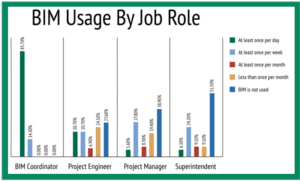 Though BIM use is spreading throughout the world, it is not being effectively used at all stages of construction. In research conducted by Britani N. Harris, just over a third of survey respondents (38.3%) use BIM personally at least once a week. In the same research, Harris found that 37.6% of the respondents do not use BIM at all.[12] Figure 3 breaks down BIM use frequency within job roles of those surveyed.