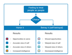 When we choose to betray our feelings to help, we place ourselves inside the box. Perhaps we sometimes permit this betrayal because choosing to help feels inconvenient, and may appear weak or unprofessional. By doing this, we miss opportunities to serve, and our view of self and others becomes warped. We begin to justify our actions, and therefore have a harder time leaving the box. As a result, both our intelligence and the intelligence of others are minimized.