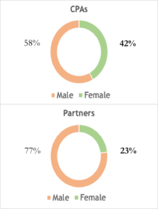 As shown in Figure 1, forty-two out of one hundred CPAs are female. At first, this number seems encouraging; however, this is only an entry-level number. The number of females who have worked up the ladder and achieved partner status is only twenty-three females out of one hundred total partners.1