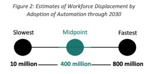 Additionally, many UBI proponents champion a more pragmatic claim for basic income. These individualsâsuch as the aforementioned presidential candidate, Andrew Yangâargue that artificial intelligence and computer automation will displace the global workforce so drastically that a UBI will be necessary to support a dwindling labor market.[4] According to the management consulting group McKinsey and Company, advanced technology could displace up to 400 million workers globally by 2030.[5] This assessment, however, is highly speculative with a large margin of error and doesnât guarantee that such events will actually take place. Figure 2 below illustrates this estimate, as well as the estimateâs wide range of uncertainty.