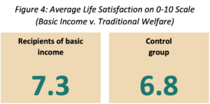 Finland, for example, just completed the worldâs first nationwide, randomized basic income trial. The experimentâsponsored by Kela, the Social Insurance Institution of Finlandâwas designed to observe whether a UBI could enhance the existing Finnish welfare state. The trial pitted recipients of a basic income against a control group that received conventional welfare benefits. Finnish researchers found that basic income recipients were no more or less likely to pursue additional employment than recipients of traditional welfare. More interestingly, researchers noticed that basic income recipients reported an increased satisfaction with life.[10] These findings are explored in Figure 4.