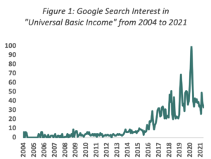 According to a recent poll by Pew Research, 45% of U.S. adults are in favor of a guaranteed, unconditional cash transfer of $1,000 per month for all adult citizens.[1] Such proposals, commonly referred to as universal basic income (UBI) strategies, have quickly captured public interest due to their increased traction in modern politics. Figure 1, which illustrates this growing interest, shows Google search frequency for the term, âuniversal basic income.â[2] Values of 100 indicate peak search interest while values of zero indicate no interest.
