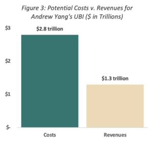 While the phrasing of Yangâs plan makes a UBI appear attractive, it ignores the issue of fiscal costs. Such a proposal would likely never be budget neutral. Figure 3 gives the estimated costs and revenues of Yangâs UBI as determined by the Tax Foundation.