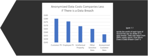 When a company keeps information anonymous, it actually costs them less in the long run. If the company is involved in a data breach, it will lose significantly less money per record compromised if the data is anonymized, as shown in Figure 1.1.