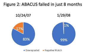 Figure 2 reflects data compiled by the SEC regarding how the makeup of ABACUS was rated at two points in time. The ABACUS deal originally closed on April 26th, 2007. As the graph shows, by October 24th, 83% of the CDO had been downgraded and 17% was on negative watch. Just 2 months later, 99% had been downgraded.9 It took ABACUS just 8 months to fail, and Goldman Sachs faced no negative repercussions because of it.