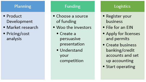 Starting a business appears daunting, but it is much more manageable if prospective business owners break down the process and take it one step at a time. Planning, finding funding, and working out logistics are all necessary steps for a company to startup smoothly. Every startup is unique and will face unique challenges, but generally, each startup will need to work through the steps summarized in Figure 3.