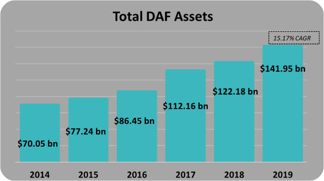 DAFs are the fastest growing charitable giving vehicle in the US, but more money is being put in DAFs than being granted out.[6] The chart below shows DAFs’ significant growth since 2014.