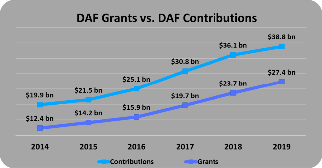 A clear trend is seen in the chart above: more money is being put in DAFs (contributions) than being paid out of DAFs (grants). This means that money designated to help social causes is sitting in these charitable giving accounts—now totaling $141 billion dollars. This is a major problem, and great change will be necessary to utilize these funds.