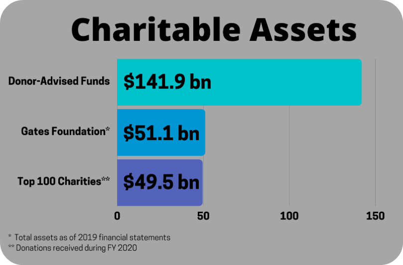 DAFs have more than enough resources to do good and solve major problems our society faces. The chart below compares DAFs with both the top 100 charities in America and the Gates Foundation, one of the largest foundations in the world.
