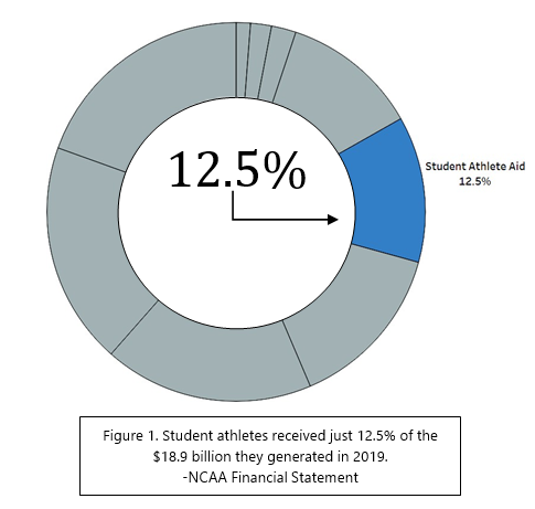 Financial statements of the National College Athletic Association (NCAA) show that student athletes generated nearly $19 billion in the year 2019.3 Figure 1 shows that although student athletes generated billions in revenue, they only see a meager 12.5% of the money through scholarships and other means.