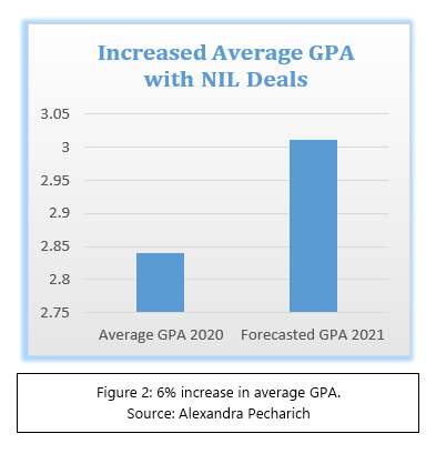Another key reason to hire an NIL specialist is because NIL deals impact academic performance. Since the legislation occurred this previous summer, student athletes have commented on decreased financial stress. Currently, student athletes have an average GPA of 2.84. Sports psychologist Alexandra Pecharich, from Florida International University, believes that the GPA will increase by approximately 6% in the first year.9 Figure 2 shows the 6% increase from 2.84 to 3.01. Decreased financial stress allows student athletes to focus more on learning and earning good grades.