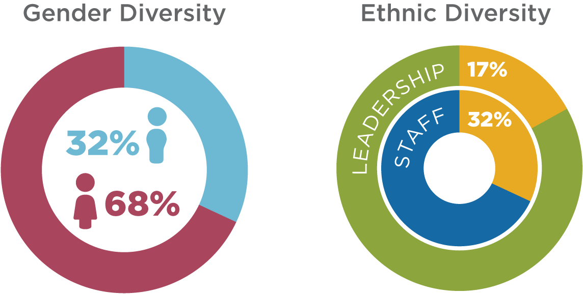 These percentages showcase the lack of diversity in corporate America. Greater representation of minorities in executive positions could significantly increase the efforts to have improved D&I programs in all workplaces.Figure 1: Ethnic Diversity percentages in leadership and staff[vi]
