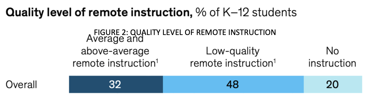 McCullough and his colleagues have held after-school tutoring labs. Still, the attendance has been “minimal.” v Mark’s conclusion on low participation is confirmed by a formal report by Nat Malkus from the American Enterprise Institute, which focuses on research designed to change public policy. Malkus summarizes that “during last school year and since numerous reports have documented that large percentages of students did not participate in the remote instruction that school districts offered.” In Los Angeles, the district “reported that as many as 40 percent of students failed to participate in its remote-learning programs.” Malkus also mentions a school district in Nevada where teachers “were unable to contact 35 percent of the student body.” vi Not only are students disengaging, but in many cases, they are not participating. Finally, a formal statistical report by a group of partners from McKinsey and Company, a consulting firm, outlines the differences in the overall quality of the remote learning experience that K-12 students have received. Interestingly, according to Figure 2, only 32% of students are deemed to have even an “average [or] above-average remote instruction,” while the other 68% have either had “low-quality” instruction or none at all. vii The solutions to continue learning despite the pandemic are far from perfect. The education of the rising generation is at stake.