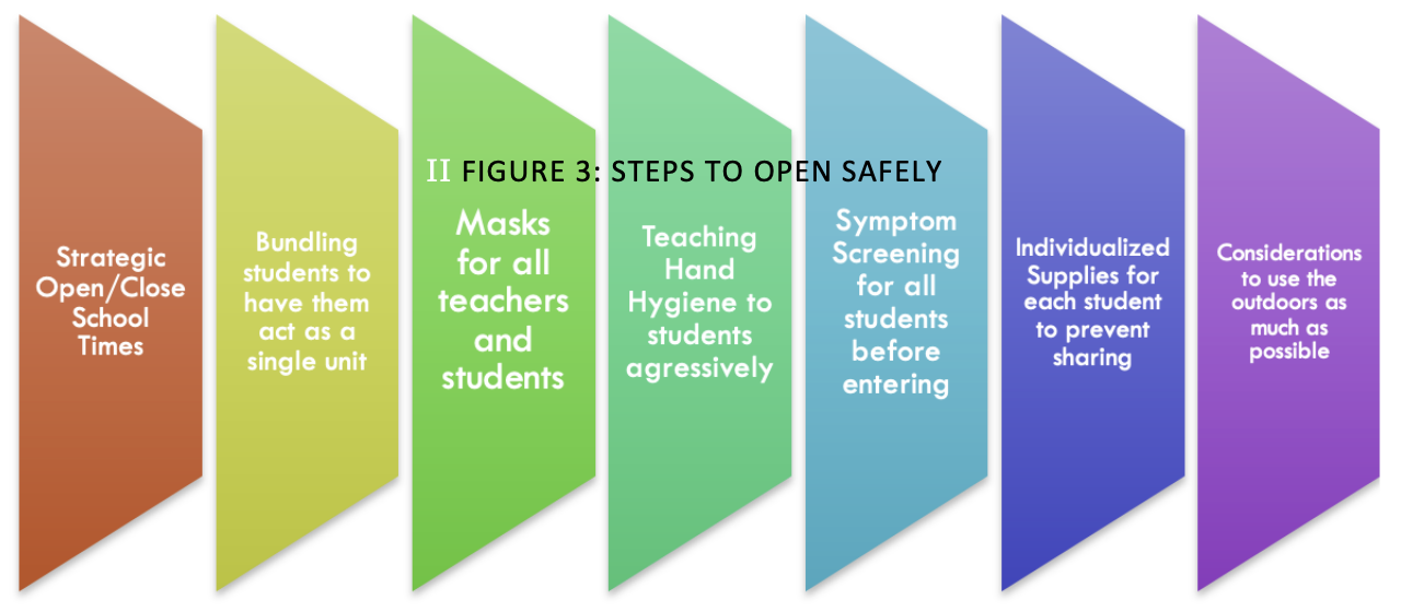 The rising generation represents the future of society and the country. Whatever can be done to improve the rising generation’s well-being and education is worth whatever sacrifice. Dr. Chagla, an Associate Professor in the Department of Medicine at McMaster University, suggests the sacrifices we can make to make in-person learning possible. x Figure 3 outlines some of these, including using masks, symptom screening, and strategically separating students to limit opportunities for contagion. With so many options and strategies already being put into place all around the country, it is apparent that it is possible to reopen our schools and be safe. At the same time, many have enjoyed and benefitted from learning from home. Going forward into the future, we can look at this last year of learning about remote learning technology and techniques as a springboard for finding the perfect learning approach for each student to enhance learning.